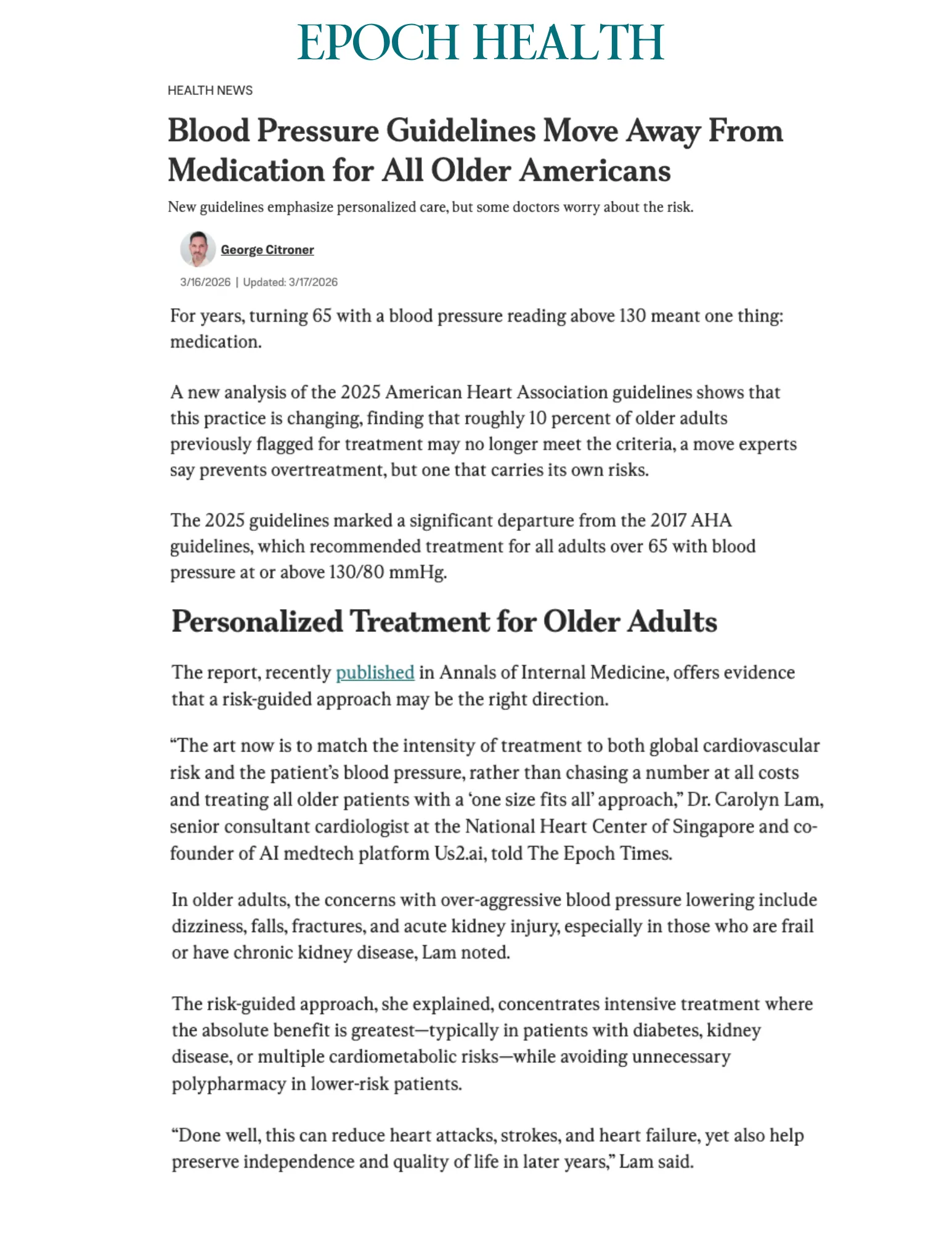 Us2.ai co-founder and senior consultant cardiologist Dr. Carolyn Lam was featured in The Epoch Times this week, speaking to the heart of this shift: that the art of good medicine lies in matching treatment intensity to the patient in front of you, not chasing a number.
